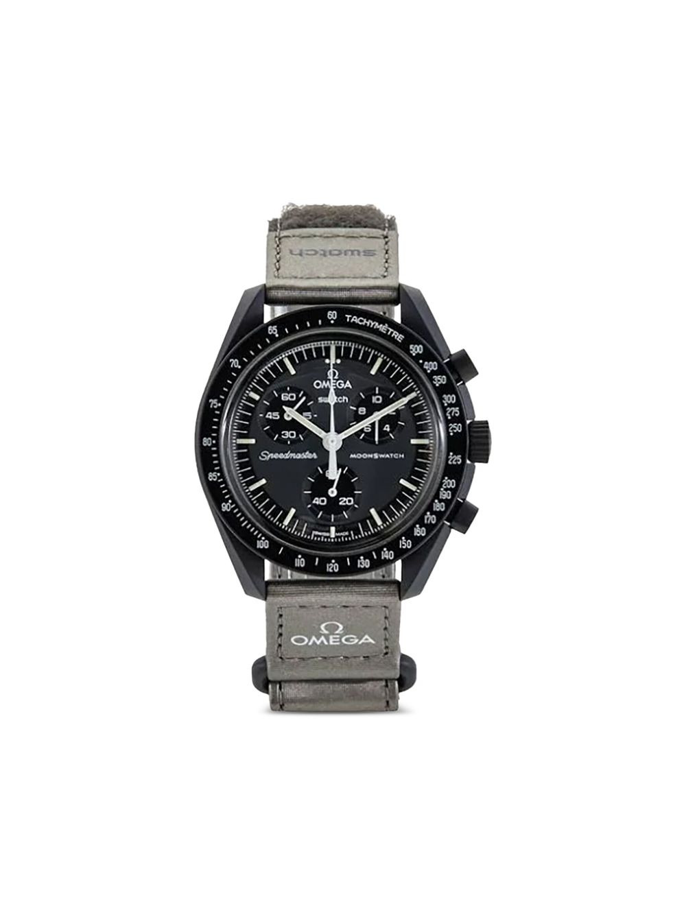 x Swatch Mission To Mercury 42mm Highlights - Black - 42mm round case - Tachymetre bezel - Chronograph - Quartz movement - 3 bar water resistant - Super-luminova - This item comes with a standard one-year warranty from the brand. Imported SIZE & FIT Measurement DIAMETER 1.65 in(4.2 cm) Thickness 0.55 in(1.4 cm)