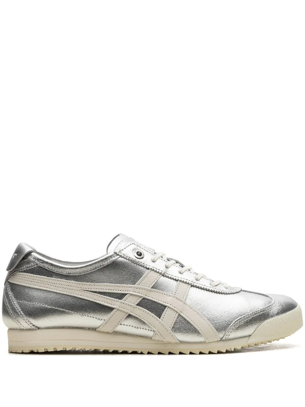 Mexico 66™ SD "Pure Silver Cream" sneakers Inspired by classic training shoes, the MEXICO 66 sneakers from Onitsuka Tiger feature an eye-catching two-tone design stitched with the legendary Onitsuka Tiger stripes. Crafted from calf leather, they have a 60's look that sits atop a flat rubber sole. Highlights - Silver-tone - Off-white - Calf leather - Metallic effect - Signature tiger stripes - Round toe - Front lace-up fastening - Logo patch at the tongue - Branded insole - Branded heel counter - Flat rubber sole Imported Composition Sole: Rubber 100% Outer: Calf Leather 100% Lining: Fabric 100% SIZE & FIT FittingInformation This piece fits large – take one size down