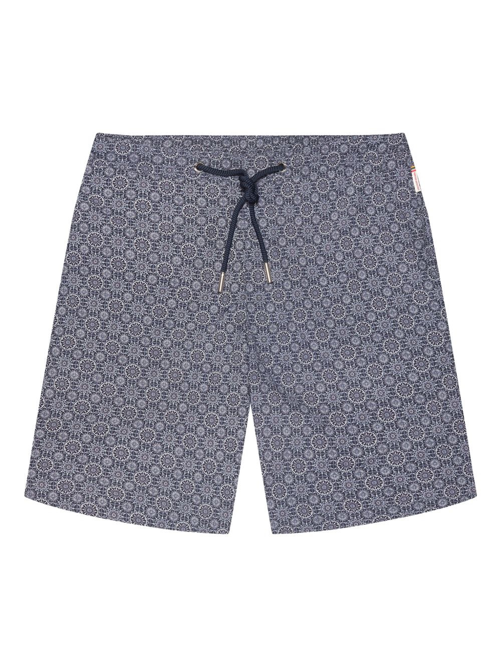 Dane patterned swim shorts Highlights - Dark blue - All-over geometric pattern - Drawstring fastening - Side pockets - Flat front - Be mindful to try on swimwear over your own garments. Imported Composition Recycled Polyester 100% Washing instructions Read Manufacturer Guidelines