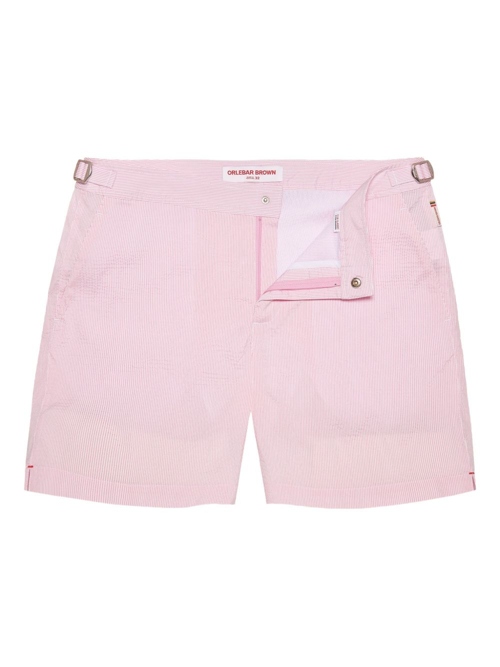 striped swim shorts Highlights - Light pink - Striped pattern - Side pockets - Adjustable buckle straps - Concealed zip and press-stud fastening - Logo patch detail - Be mindful to try on swimwear over your own garments. Imported Composition Outer: Polyester 34%, Polyamide 34%, Elastomultiester 32% Lining: Polyester 100% Washing instructions Machine Wash