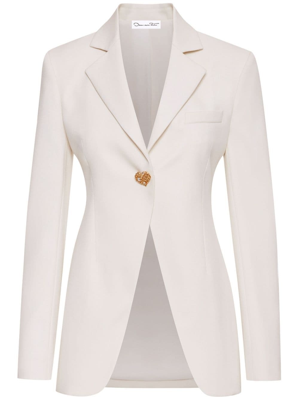 button-detail virgin-wool blazer Highlights - Ivory white - Virgin wool - Wide notch lapels - Single front button fastening - Sculptural gold-tone button - Embellished gold-tone button - Long sleeves - Buttoned cuffs - Chest welt pocket - Straight hem - Silk lining - Model is 5'10.5" / 180 cm and wearing size 2 Made in Italy Composition Lining: Silk 100% Outer: Virgin Wool 98%, Elastane 2%