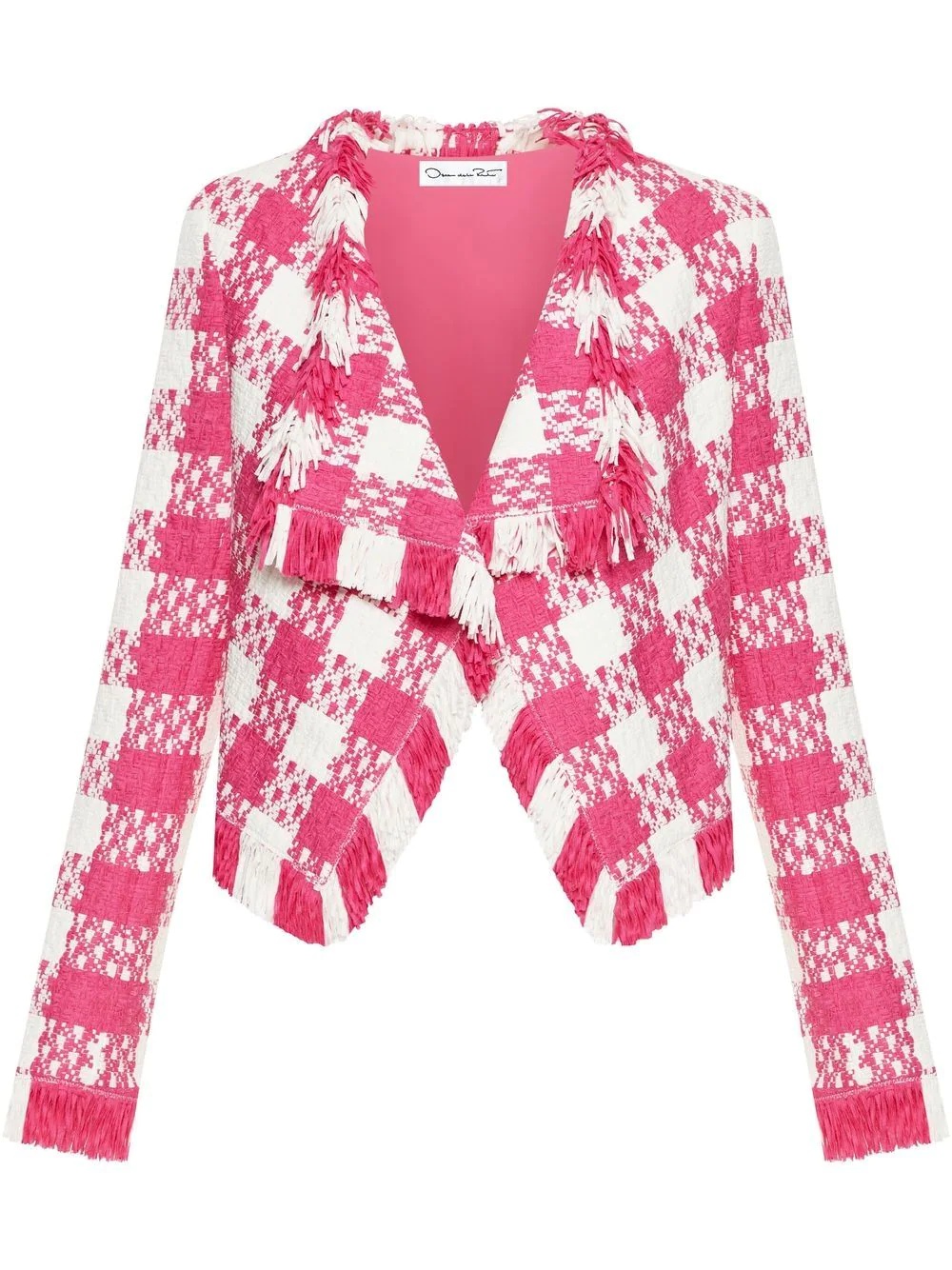 check-print woven open-front jacket Highlights - Pink/white - Cotton-wool blend - Check pattern - Fringed edge - Open front - Long sleeves Made in Italy Composition Cotton 65%, Polyamide 29%, Virgin Wool 6%