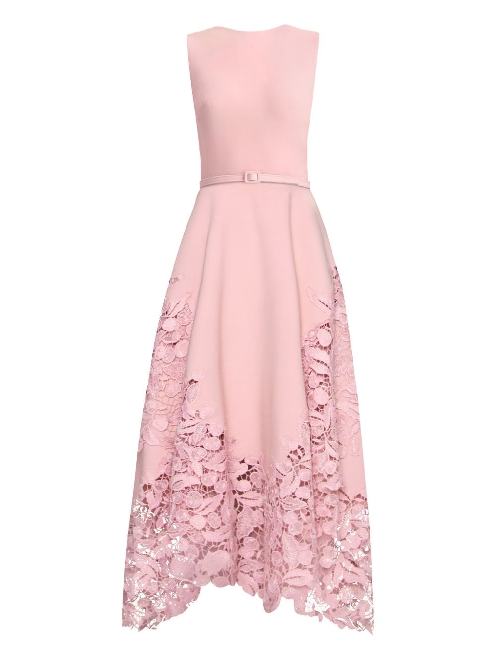 Cherry Guipure Lace midi dress Highlights - Light pink - Concealed rear zip fastening - Crew neck - Belted waist - Asymmetric hem - Model is 5'10.5" / 180 cm and wearing size 2 Made in Italy Composition Polyester 100%, Virgin Wool 94%, Elastane 5%, Polyamide 1% Washing instructions Read Manufacturer Guidelines