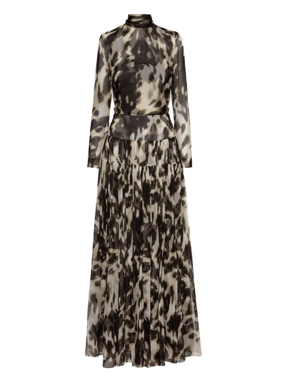 cowhide-print pleated maxi dress Highlights - Ecru black - Cowhide print - High neck - Long sleeves - Pleated skirt - Silk chiffon - Model is 5'10.5" / 180 cm and wearing size 2 Made in Italy Composition Silk 100% Washing instructions Read Manufacturer Guidelines