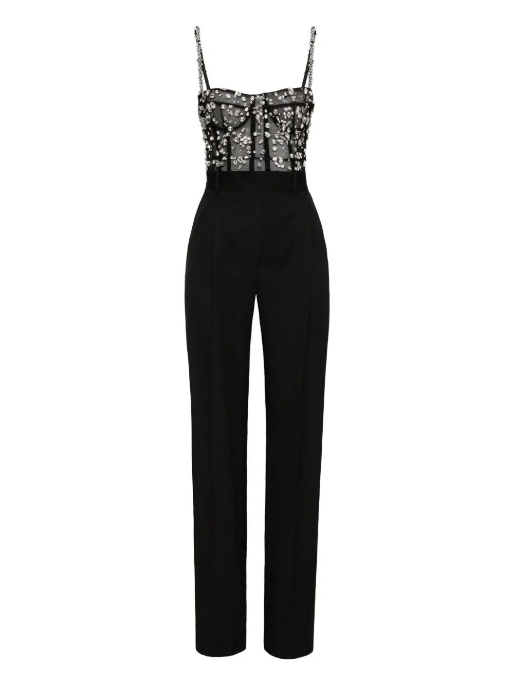 crystal-embellished jumpsuit Highlights - Black - Crystal embellishment - Sheer panel - Corset bodice - Straight hemline - Model is 5'10.5" / 180 cm and wearing size 2 Made in Italy Composition Polyamide 100% Washing instructions Read Manufacturer Guidelines