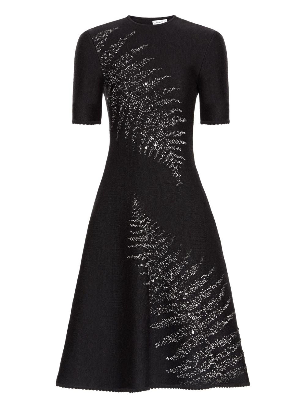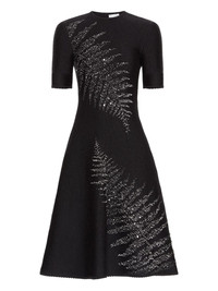 fern-embroidered knit dress Highlights - Black - Fern embroidery - Short sleeves - Round neck - Wool blend - Scalloped hem - Model is 5'10.5" / 180 cm and wearing size xs Made in Italy Composition Virgin Wool 80%, Silk 13%, Polyester 4%, Polyamide 2%, Elastane 1% Washing instructions Read Manufacturer Guidelines
