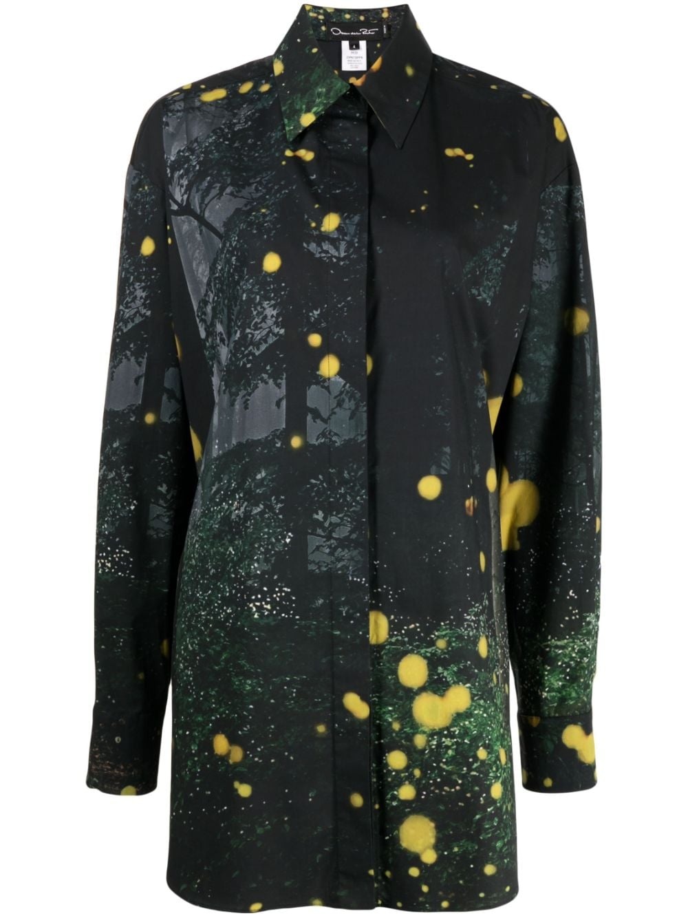 Firefly-print long-sleeve shirt The Firefly print – an AW23 mainstay depicting a lit-up forest scene – decorates this OSCAR DE LA RENTA shirt. It features a concealed front button fastening and long sleeves. Highlights - Black/multicolour - Stretch-cotton - All-over graphic print - Straight-point collar - Concealed front button fastening - Long sleeves - Buttoned cuffs - Straight hem Made in Italy Composition Cotton 97%, Elastane 3% SIZE & FIT Model measurements Height 5 ft 10 in(1.77 m) Bust/Chest 31.49 in(80 cm) Hips 35.43 in(90 cm) Waist 25.19 in(64 cm) FittingInformation Designed to be unstructured, offering a loose fit throughout Made from a lightweight stretch fabric, this piece offers elasticity and flexibility when worn This piece fits true to size – take your usual size