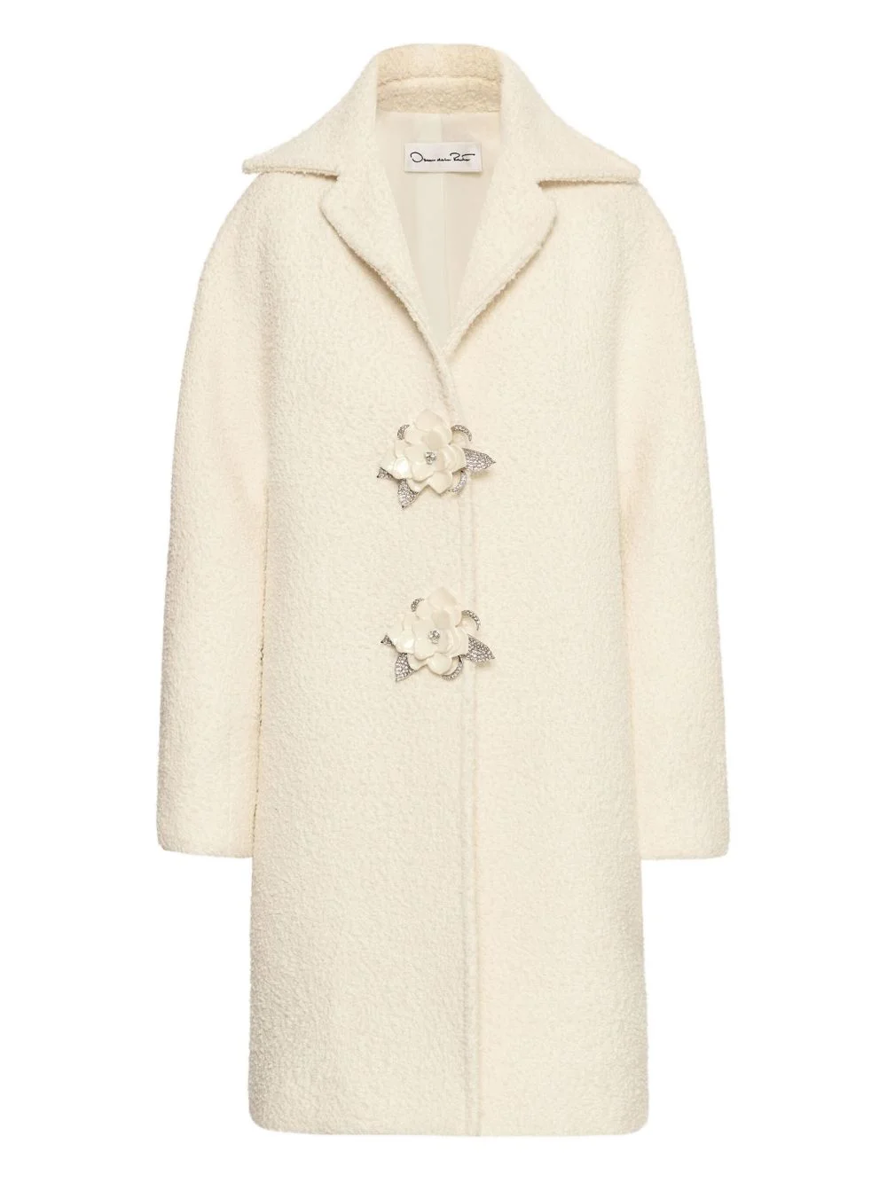 floral-button boucle coat Highlights - Ivory - Floral embellishment - Boucle texture - Button fastening - Lapel collar Made in Italy Composition Outer: Polyester 72%, Wool 24%, Polyamide 2%, Silk 2% Lining: Silk 100% Washing instructions Read Manufacturer Guidelines