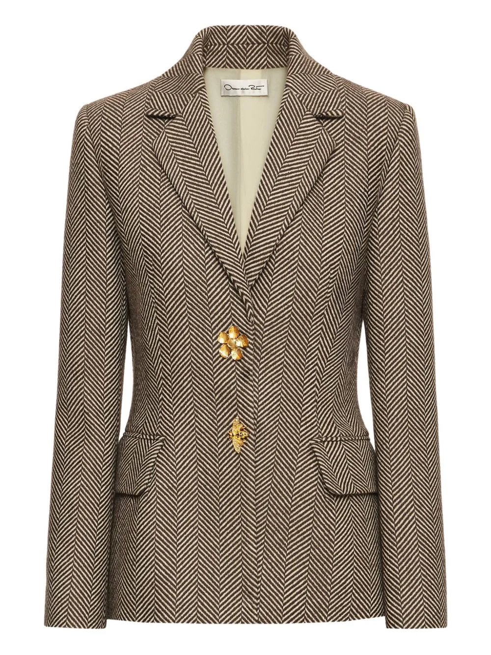 floral button jacket Highlights - Walnut - Chevron pattern - Floral button - Notched lapels - Front flap pockets Made in Italy Composition Outer: Virgin Wool 54%, Cashmere 46% Lining: Silk 100% Washing instructions Read Manufacturer Guidelines