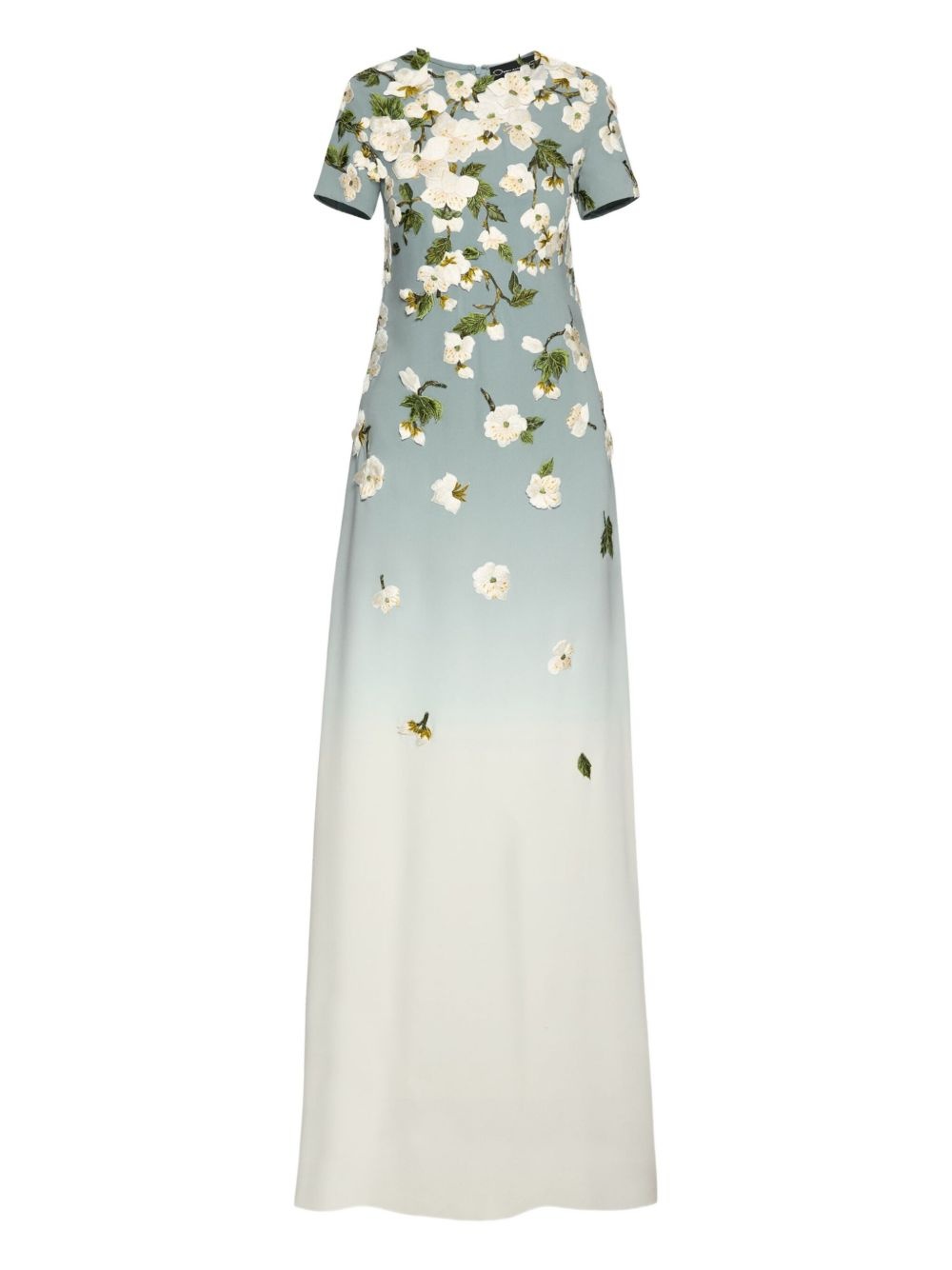 floral-embellished gown Highlights - Pale blue - Floral appliques - Short sleeves - Embroidered details - Round neckline - Flowing silhouette - Ombre effect - Model is 5'10.5" / 180 cm and wearing size 2 Imported Composition Silk 94%, Elastane 6% Washing instructions Read Manufacturer Guidelines