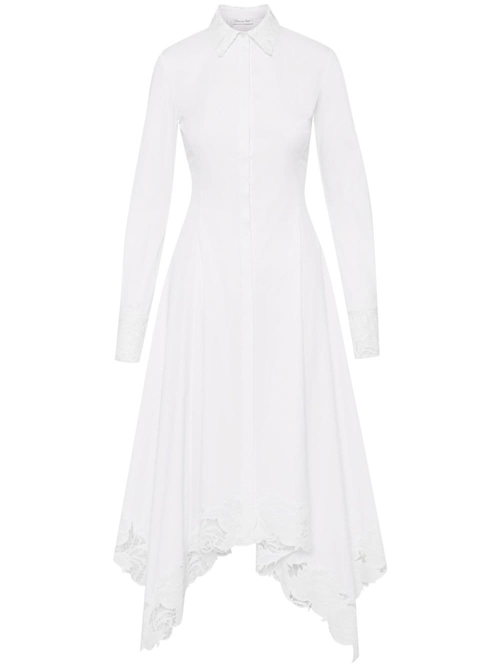 Floral Guipure handkerchief dress Highlights - White - Cotton - Guipure lace details - Floral motif - Spread collar - Concealed front button fastening - Long sleeves - Buttoned cuffs - Dart detailing - Handkerchief hem - Asymmetric hem - Model is 5'10.5" / 180 cm and wearing size 2 Made in United States Composition Lining: Cotton 100% Outer: Polyester 100%, Cotton 98%, Elastane 2% SIZE & FIT FittingInformation Designed for a close fit at the chest and waist with a loose fit at the hip Made from a lightweight stretch fabric, this piece offers elasticity and flexibility when worn