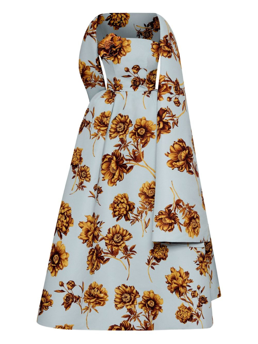 floral-print strapless gown Highlights - Ice blue - Floral print - Strapless - Detachable shawl - Peony motif - Model is 5'10.5" / 180 cm and wearing size 2 Made in United States Composition Polyester 100% Washing instructions Read Manufacturer Guidelines