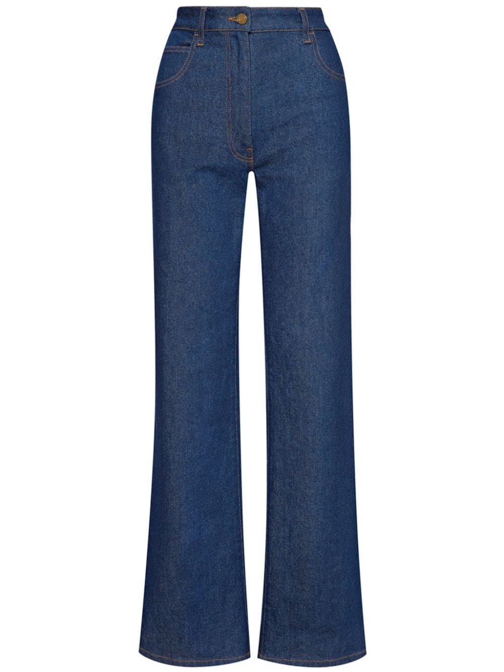 high-rise straight-leg jeans Highlights - Indigo blue - Stretch-cotton - Contrast stitching - Belt loops - Concealed fly and button fastening - High-waisted - Straight leg - Classic five pockets - Straight hem - Model is 5'10.5" / 180 cm and wearing size 2 Made in Italy Composition Cotton 99%, Elastane 1% SIZE & FIT FittingInformation Designed for a straight-leg fit, these trousers allow for a close fit at the waist and an unrestricted, comfortable fit over the leg This piece fits true to size – take your usual size Washing instructions Dry Clean Only
