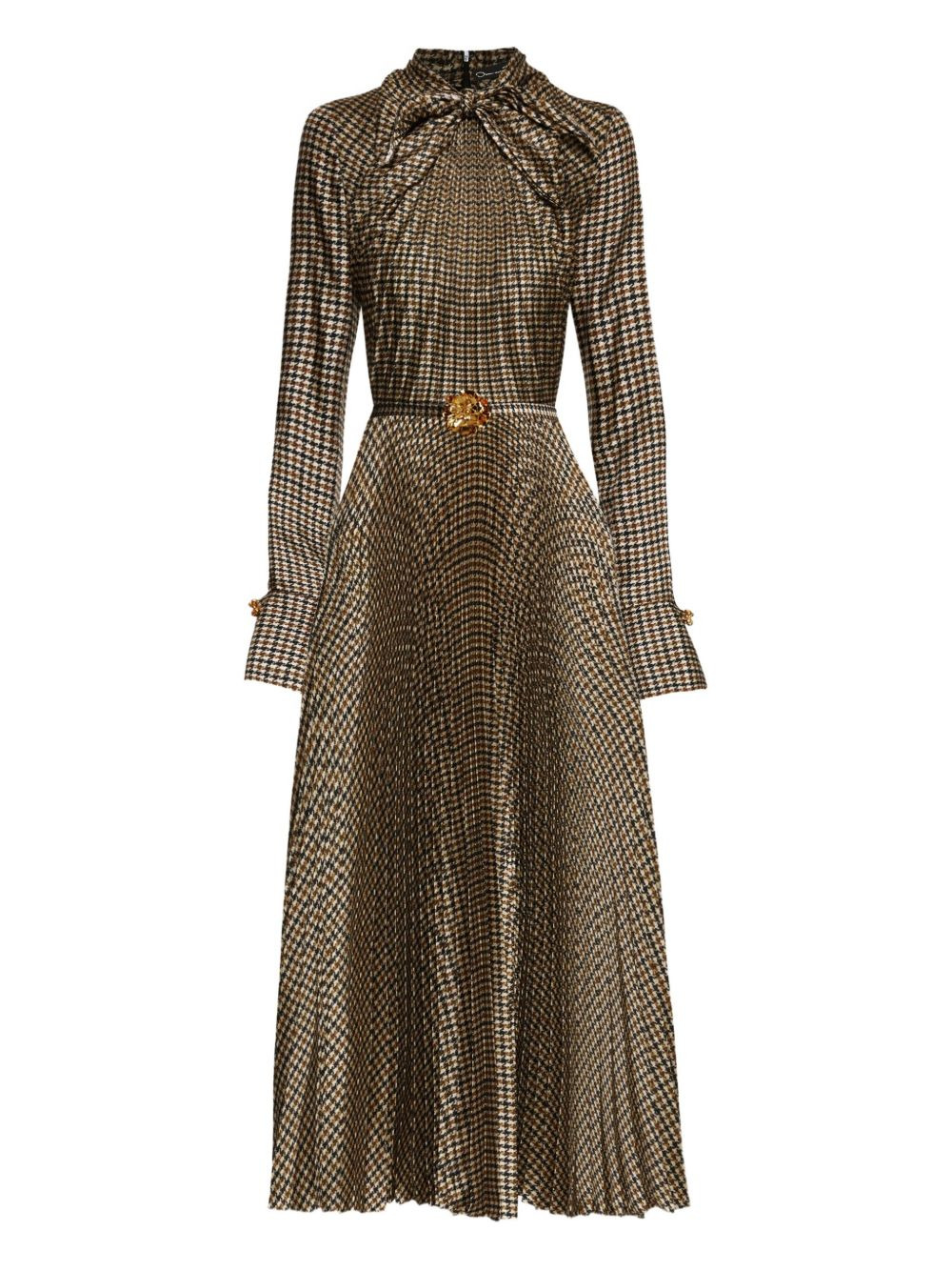 houndstooth pleated midi dress Highlights - Brown/multicolour - Houndstooth check pattern - Tie neck - Pleated skirt - Long sleeves - Gold-tone belt - Model is 5'10.5" / 180 cm and wearing size 2 Made in Italy Composition Polyester 100% Washing instructions Read Manufacturer Guidelines