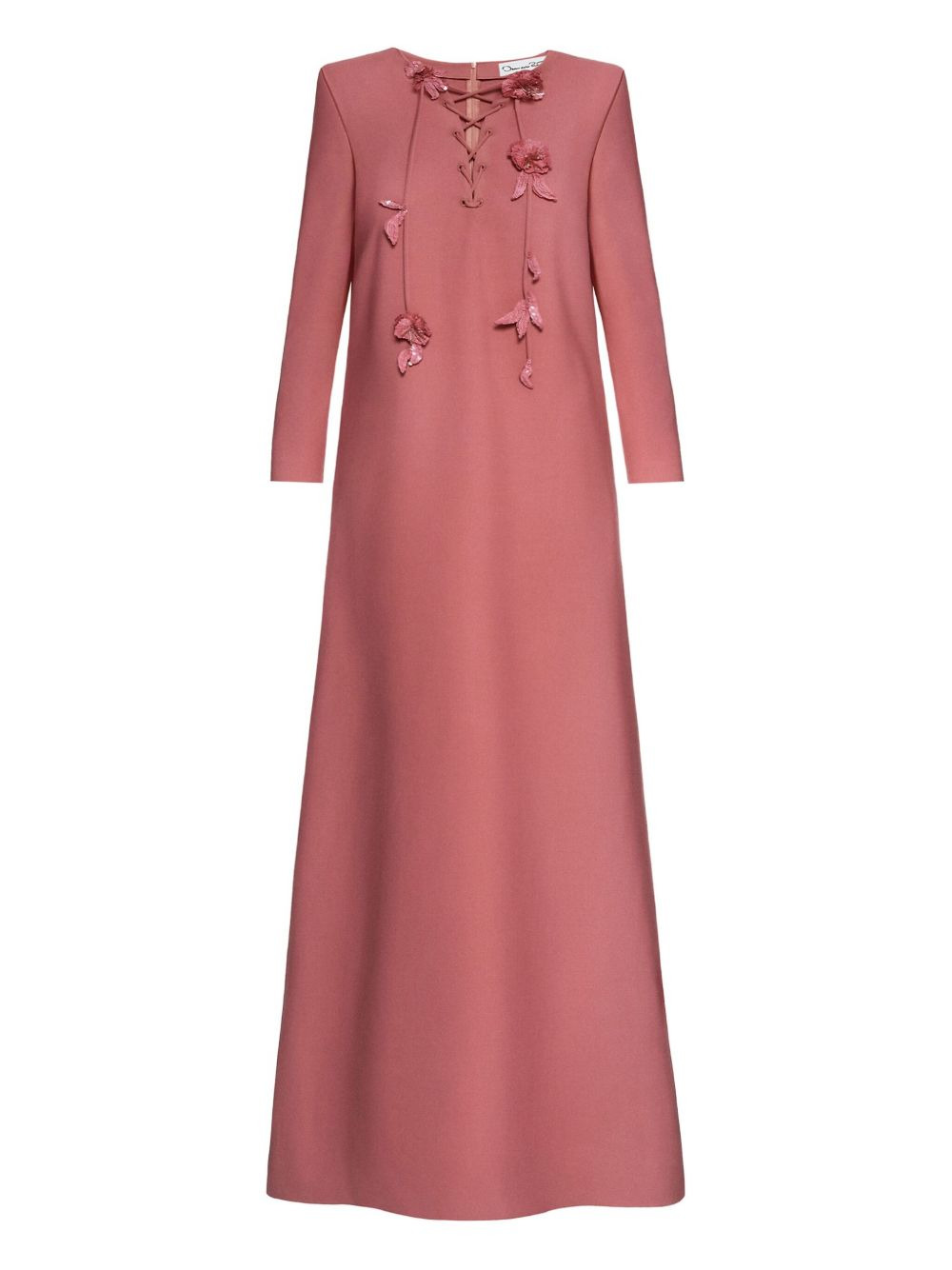 lace-up floral maxi dress Highlights - Rose pink - Lace-up front - Three-quarter length sleeves - Floral embellishment - A-line shape - Maxi length - Model is 5'10.5" / 180 cm and wearing size xs Made in Italy Composition Virgin Wool 94%, Elastane 5%, Polyamide 1% Washing instructions Read Manufacturer Guidelines