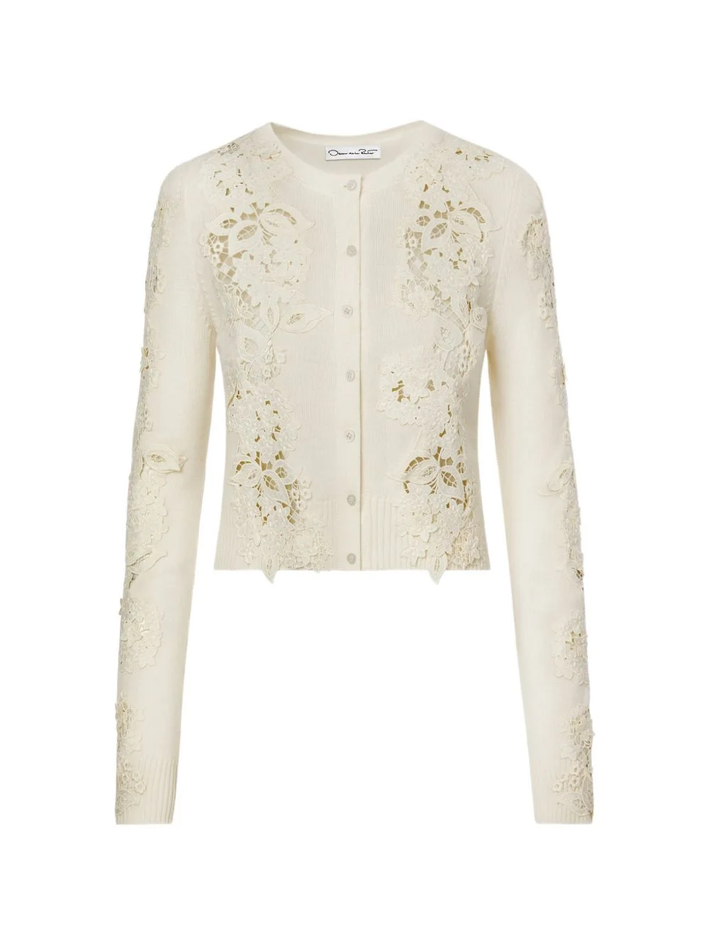 Porcelain floral guipure insert cardigan Highlights - Ivory - Floral applique - Round neck - Button fastening - Long sleeves - Ribbed hem Made in Italy Composition Wool 100% Washing instructions Read Manufacturer Guidelines