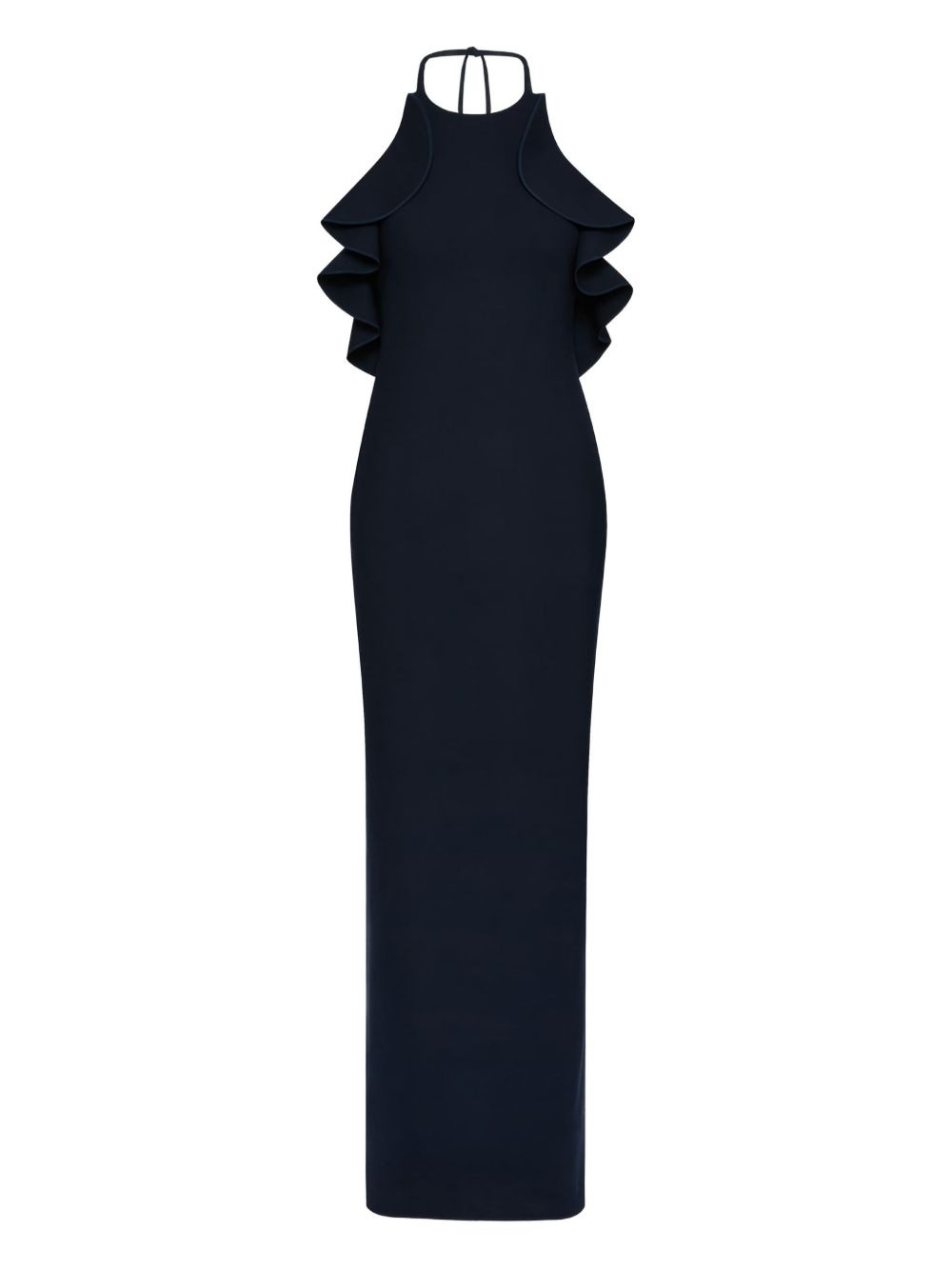 ruffled column gown Highlights - Navy blue - Halterneck - Ruffle detail - Open back - Column style - String fastening Made in Italy Composition Virgin Wool 94%, Elastane 5%, Polyamide 1% Washing instructions Read Manufacturer Guidelines