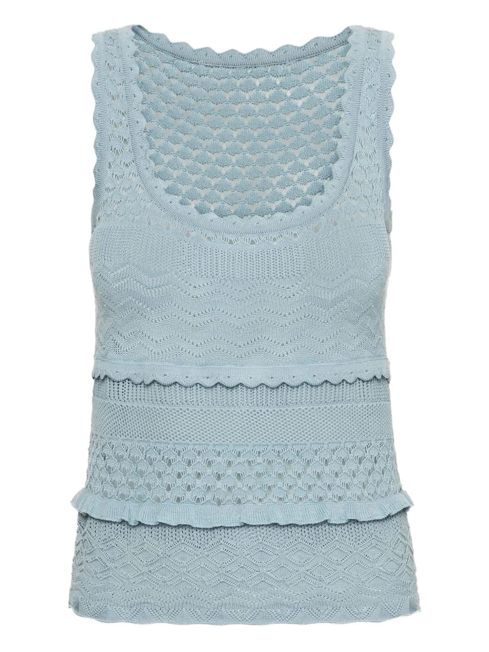 scallop tank top Highlights - Sky blue - Open knit - Scalloped trim - Sleeveless - Scoop neck Made in Italy Composition Silk 55%, Cotton 45% Washing instructions Read Manufacturer Guidelines