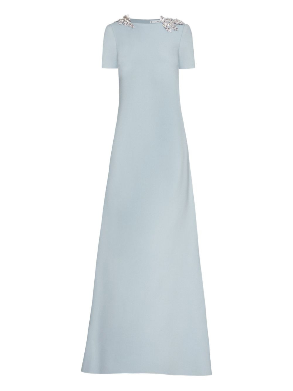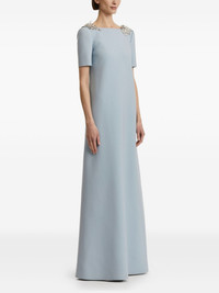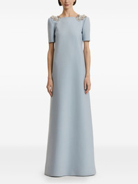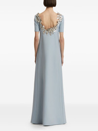 sequin-embellished open-back dress Highlights - Light blue - Short sleeves - Open back - Sequin embellishment - Leaf-shaped embellishment - A-line skirt - Model is 5'10.5" / 180 cm and wearing size xs Made in Italy Composition Virgin Wool 94%, Elastane 5%, Polyamide 1% Washing instructions Read Manufacturer Guidelines