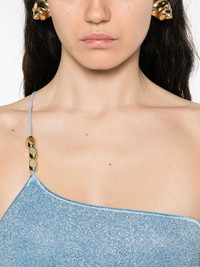 chain-embellished one-shoulder dress Highlights - Light blue - Glitter fabric - One-shoulder neckline - Chain strap detail Made in Italy Composition Outer: Polyamide 64%, Metallised Fibres 36% Lining: Polyamide 82%, Elastane 18% SIZE & FIT Model measurements Height 5 ft 9 in(1.75 m) Bust/Chest 32.67 in(83 cm) Hips 36.22 in(92 cm) Waist 24.8 in(63 cm) FittingInformation Designed for a close fit throughout Slightly short in length; consider your own measurements Made from a lightweight fabric Washing instructions Hand Wash