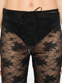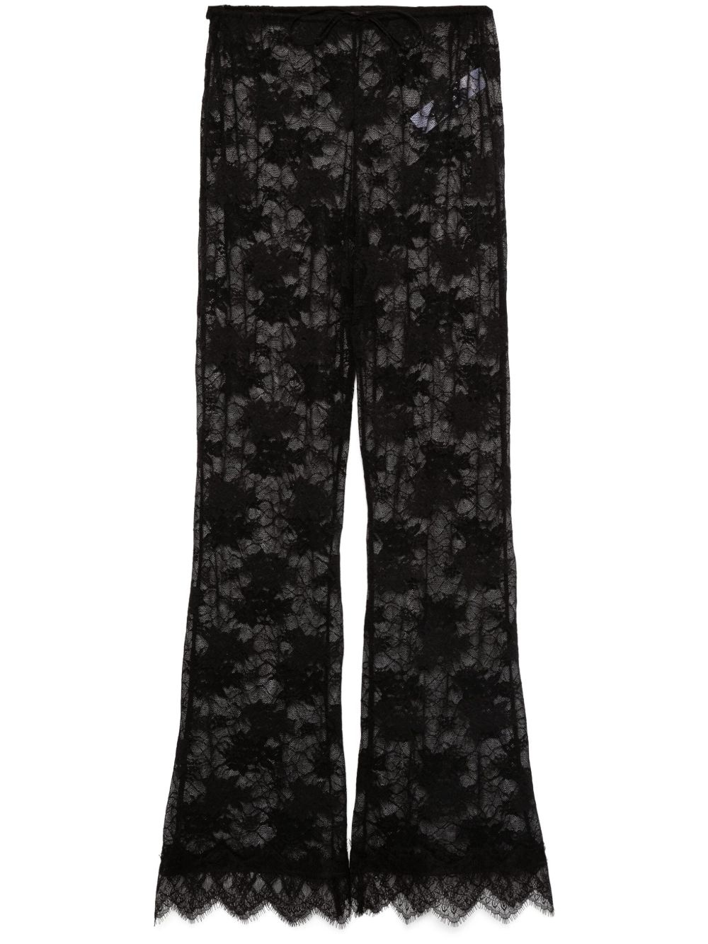 lace trousers Highlights - Black - Semi-sheer construction - Lace design - Drawstring waist - Mid-rise - Scallop edge - Flared hem Made in Italy Composition Polyamide 85%, Elastane 15% SIZE & FIT Model measurements Height 5 ft 10 in(1.78 m) Bust/Chest 33.85 in(86 cm) Hips 36.61 in(93 cm) Waist 26.77 in(68 cm) FittingInformation Designed with a flared hem, these trousers allow for a close fit at the waist with a slim fit over the leg and widening towards the hem Made from a lightweight stretch fabric, this piece offers elasticity and flexibility when worn