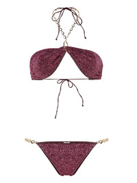 Lumiere O Chain lurex bikini Highlights - Aubergine - Stretch-design - Lurex detailing - Gold-tone hardware - Bandeau style - Crystal embellishment - Ring hardware detailing - Chain-link detailing - Halterneck tie fastening - Rear tie fastening - Chain-link side straps - High cut - Be mindful to try on swimwear over your own garments. Made in Italy Composition Outer: Polyamide 64%, Metallic Fibre 36% Lining: Polyamide 85%, Elastane 15%