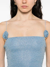 Oseree rose-embellished dress Highlights - Blue - Glitter fabric - Side slit - Spaghetti straps - Rose embellishments straps - Straight neckline Made in Italy Composition Outer: Polyamide 64%, Metallised Fibres 36% Lining: Polyamide 82%, Elastane 18% SIZE & FIT Model measurements Height 5 ft 9 in(1.75 m) Bust/Chest 32.67 in(83 cm) Hips 36.22 in(92 cm) Waist 24.8 in(63 cm) Washing instructions Machine Wash