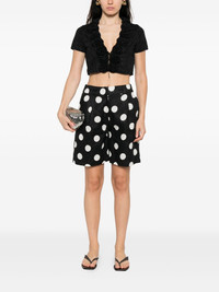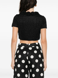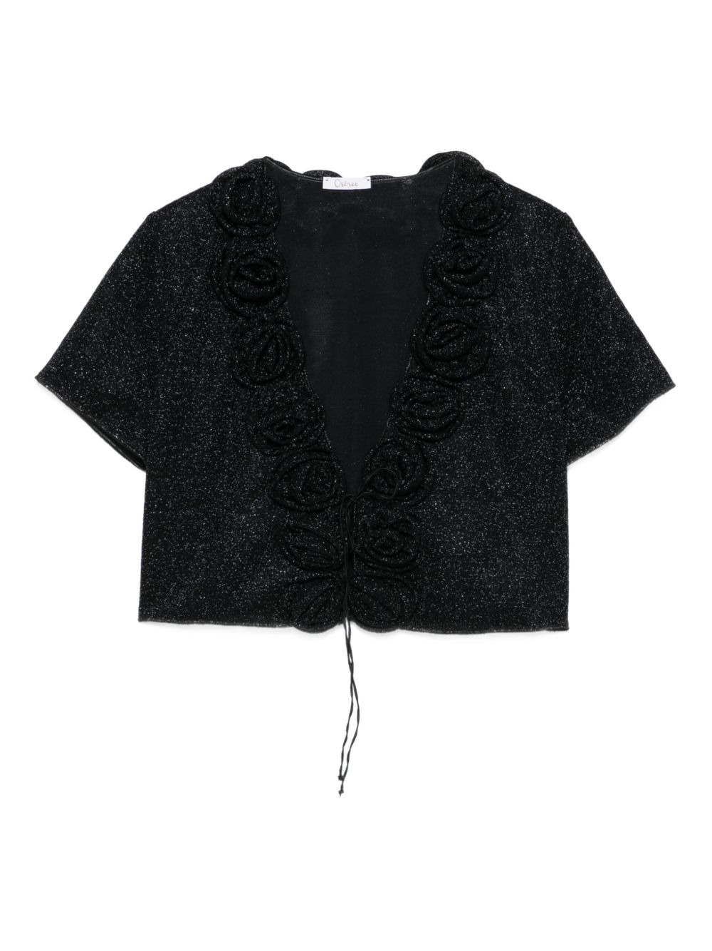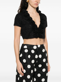 rose-embellished glitter-detail top Highlights - Black - Glitter fabric - Rose embellishment neckline - Short sleeves - V-neck - Tie fastening Made in Italy Composition Outer: Polyamide 64%, Metallised Fibres 36% Lining: Polyamide 82%, Elastane 18% SIZE & FIT Model measurements Height 5 ft 9 in(1.75 m) Bust/Chest 32.67 in(83 cm) Hips 36.22 in(92 cm) Waist 24.8 in(63 cm) Washing instructions Machine Wash