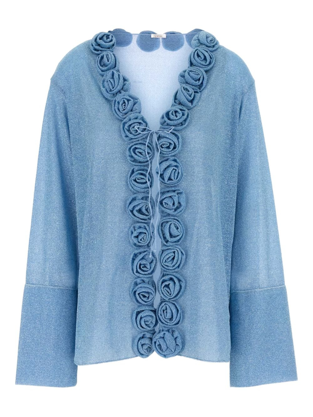 rose-embellished lurex cardigan Highlights - Light blue - Lurex design - Rose embellishments - V-neck - Long sleeves - Wide cuffs Made in Italy Composition Nylon 64%, Metallised Fibres 36% Washing instructions Dry Clean Only