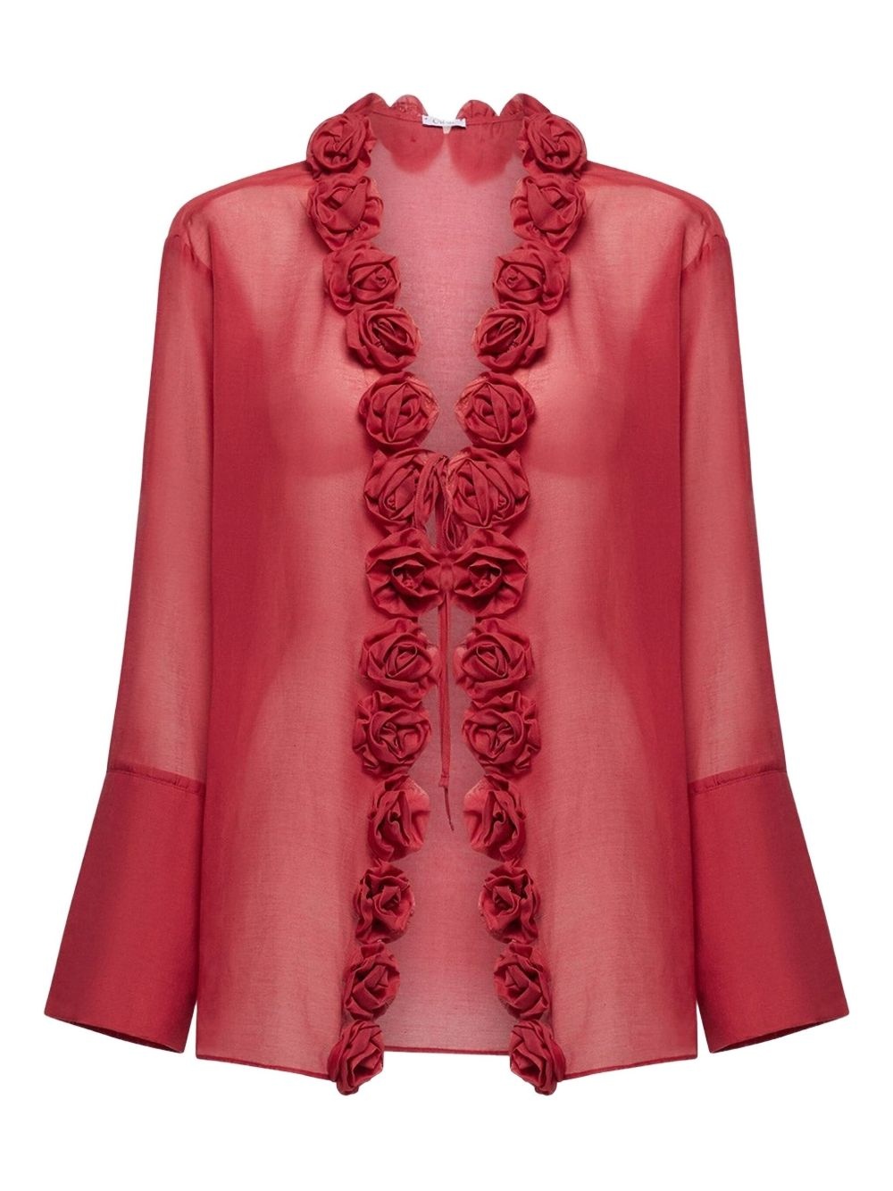 rose-embellished sheer blouse Highlights - Deep red - Floral applique detailing - Flared sleeves - Tie closure Made in Italy Composition Cotton 70%, Silk 30%