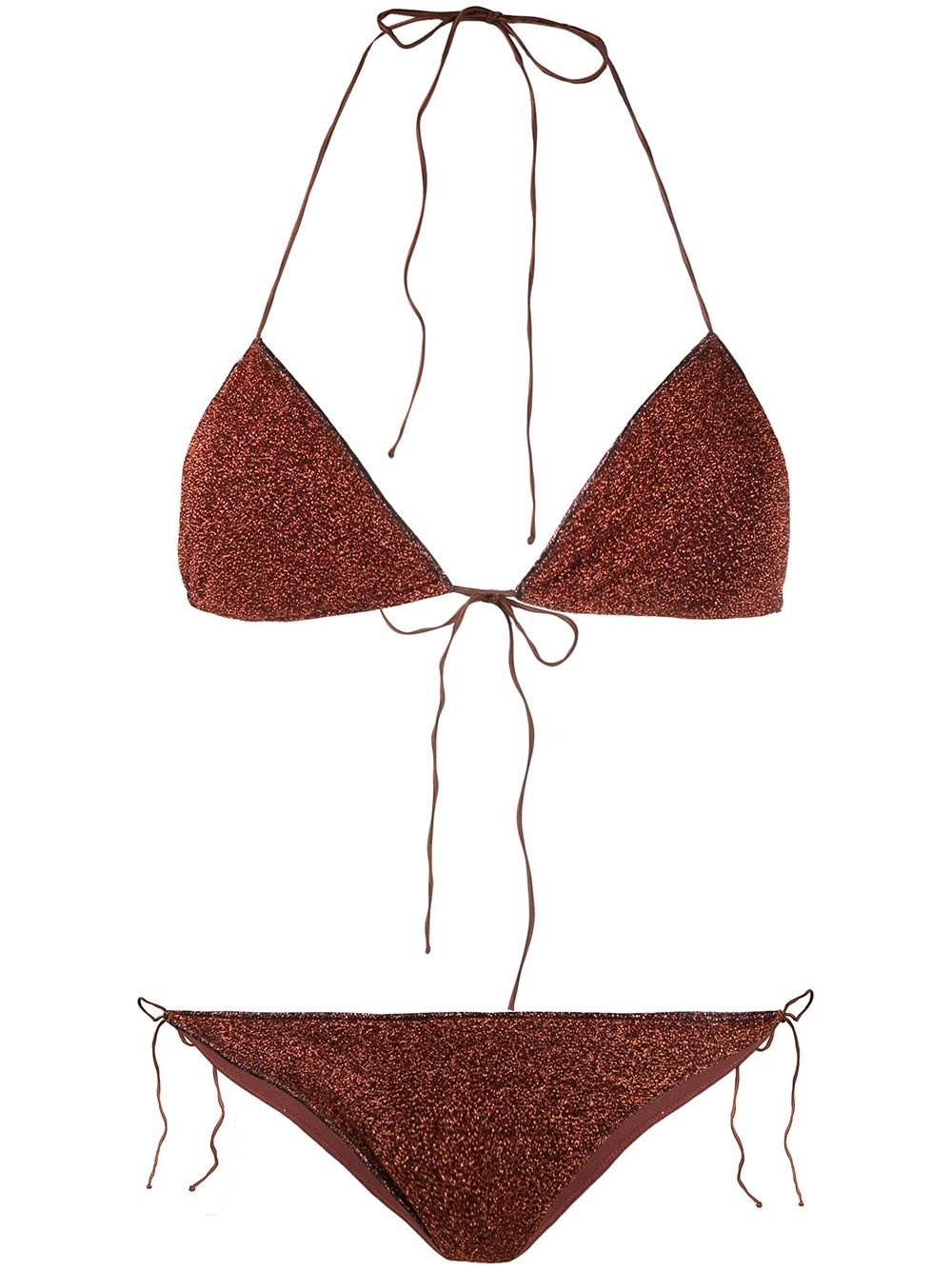 two-piece bikini set brown/bronze glitter detailing halterneck rear tie fastening side tie fastening Be mindful to try on swimwear over your own garments Made in Italy Composition Polyester 100%, Nylon 85%, Elastane 15% Washing instructions Hand Wash