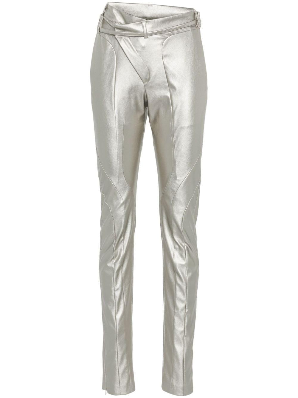 asymmetric waist trousers Highlights - Silver - Asymmetric waist - Belt loops - Self-tie waist fastening - Panelled design - Rear welt pocket - Skinny cut Imported Composition Polyurethane 50%, Polyester 50% SIZE & FIT Model measurements Height 5 ft 9 in(1.76 m) Bust/Chest 31.1 in(79 cm) Hips 36.61 in(93 cm) Waist 24.8 in(63 cm) FittingInformation Designed for a close fit throughout Made from a midweight non-stretch fabric, this piece offers minimal elasticity when worn This piece fits true to size – take your usual size Washing instructions Dry Clean Only