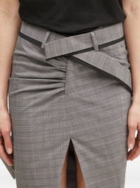 belted check-print skirt Highlights - Grey - Check print - Draped detail - Asymmetrical hem - Front slit - Belted waist Imported Composition Lining: Polyester 47%, Acrylic 26%, Viscose 24%, Elastane 3% Outer: Polyester 54%, Wool 44%, Elastane 2% Washing instructions Read Manufacturer Guidelines