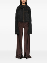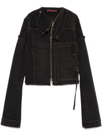draped collar denim jacket Highlights - Dark grey - Front zip fastening - Long sleeves - Three front patch pockets - Buttoned cuffs Imported Composition Recycled Cotton 52%, Recycled Polyester 25%, Viscose 17%, Elastane 6% SIZE & FIT Model measurements Height 5 ft 11 in(1.8 m) Bust/Chest 35.03 in(89 cm) Hips 35.03 in(89 cm) Waist 23.62 in(60 cm) FittingInformation Designed for a slim fit that sits just away from the body offering a close yet comfortable fit The sleeves are constructed with additional length and built-in thumb loops that allow for movement and a secure fit Constructed from stretch denim, this piece offers a stretch fit with durability Washing instructions Machine Wash