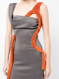 faux-fur trim sleeveless minidress Highlights - Medium grey/carrot orange - Stretch-design - Satin finish - Faux-fur trim - Square neck - Single shoulder strap - Sleeveless - Fitted waistline - Straight hem - Thigh-length Imported Composition Body: Polyamide 63%, Polyester 24%, Elastane 13% SIZE & FIT Model measurements Height 5 ft 9 in(1.76 m) Bust/Chest 31.1 in(79 cm) Hips 35.03 in(89 cm) Waist 24.4 in(62 cm) FittingInformation Designed for a close fit throughout Made from a midweight non-stretch fabric, this piece offers minimal elasticity when worn This piece fits true to size – those with curvy hips may wish to take one size up Washing instructions Machine Wash
