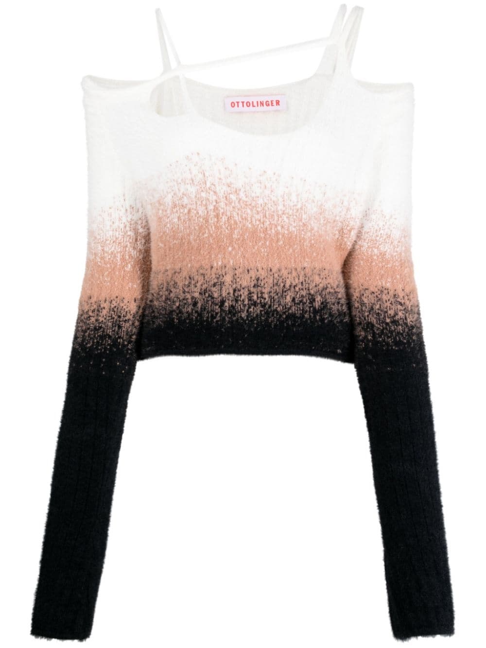 gradiebt-effect off-shoulder knitted jumper Highlights - White/black/rose pink - Knitted construction - Gradient effect - Brushed effect - Off-shoulder - Spaghetti straps - Long sleeves - Straight hem Imported Composition Polyamide 100% SIZE & FIT Model measurements Height 5 ft 11 in(1.8 m) Bust/Chest 31.49 in(80 cm) Hips 36.22 in(92 cm) Waist 25.59 in(65 cm) FittingInformation Designed for a close fit throughout Made with a midweight knit, this piece offers some stretch This piece fits true to size – take your usual size Washing instructions Hand Wash