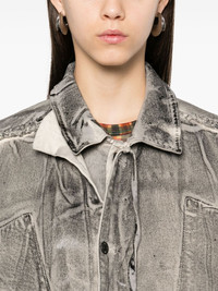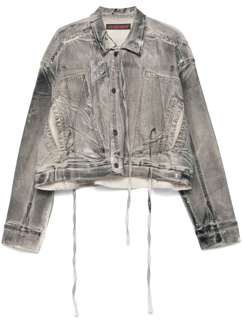 layered denim jacket Highlights - Grey - Cotton blend - Denim - Coated finish - Layered design - Front button fastening - Strap detailing - Drop shoulder - Long sleeves - Buttoned cuffs - Two side slit pockets - Waist tabs - Straight hem Imported Composition Cotton 77%, Rubber 14%, Recycled Polyester 7%, Elastane 2% SIZE & FIT Model measurements Height 5 ft 10 in(1.78 m) Bust/Chest 33.85 in(86 cm) Hips 36.61 in(93 cm) Waist 26.77 in(68 cm) FittingInformation Designed to be unstructured, offering a loose fit throughout Made from a midweight stretch fabric, this piece offers elasticity and flexibility when worn