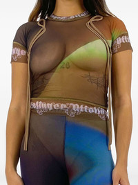 mesh T-shirt Highlights - Brown - Abstract print - Mesh fabric - Short sleeves - Tie detailing Imported Composition Recycled Polyester 90%, Elastane 10% Washing instructions Read Manufacturer Guidelines