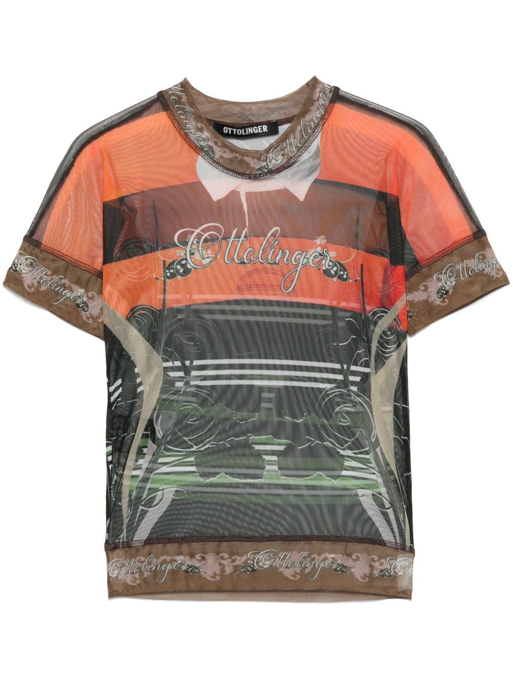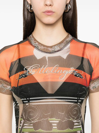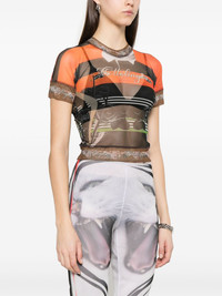 polo-print mesh T-shirt Highlights - Orange - Crew neck - Short sleeves - Straight hem Imported Composition Recycled Polyester 90%, Spandex/Elastane 10% SIZE & FIT Model measurements Height 5 ft 10 in(1.78 m) Bust/Chest 33.85 in(86 cm) Hips 36.61 in(93 cm) Waist 26.77 in(68 cm) Measurement LENGTH 18.11 in(46 cm) BUST 29.92 in(76 cm) FittingInformation Designed for a close fit throughout Made from a lightweight stretch fabric, this piece offers elasticity and flexibility when worn