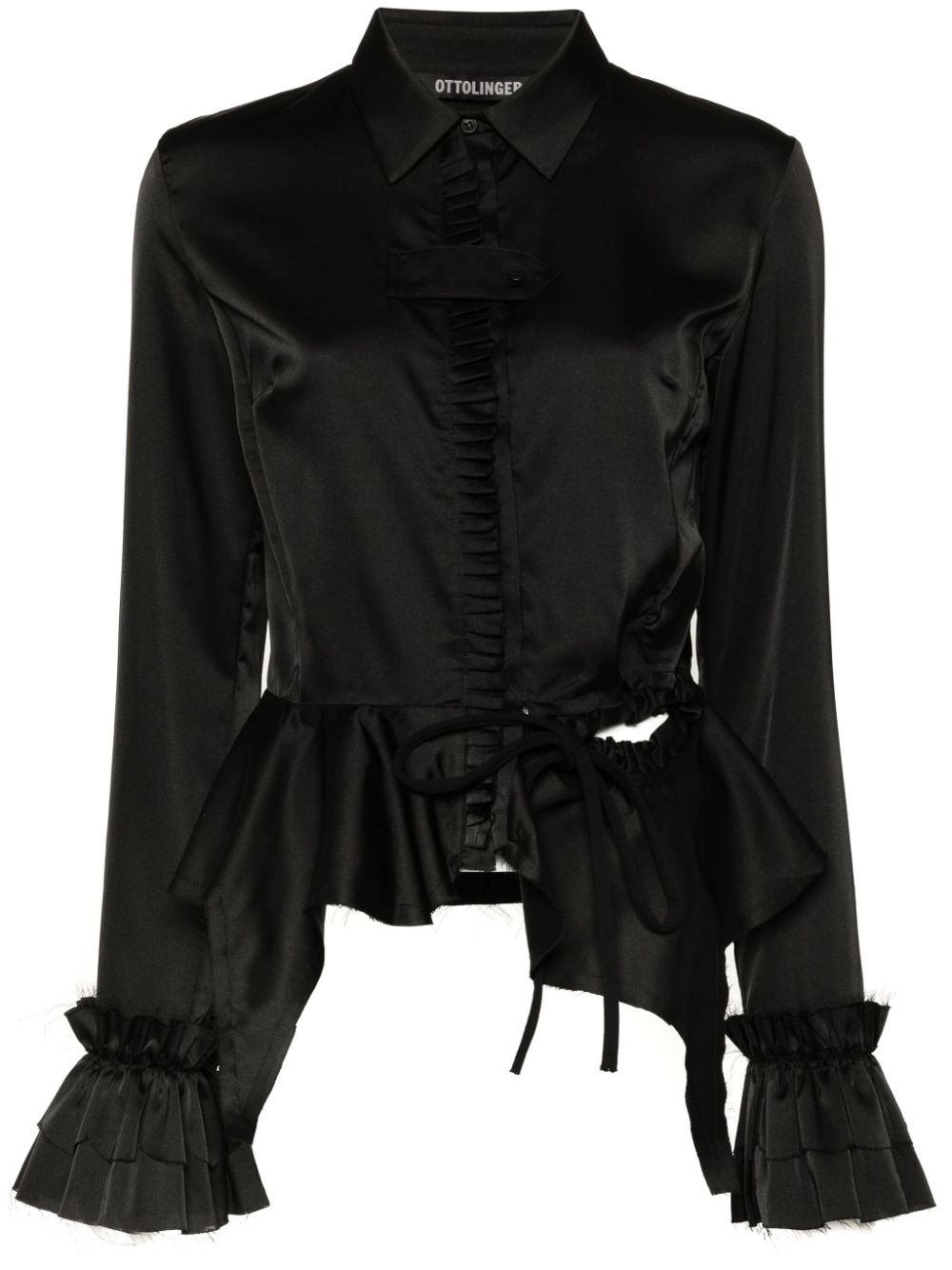 ruffled shirt Highlights - Black - Satin weave - Pointed flat collar - Long sleeves - Ruffle cuffs - Ruffled detailing - Side-tie detailing - Draped detailing - Concealed front button fastening Imported Composition Polyester 97%, Elastane 3% SIZE & FIT Model measurements Height 5 ft 10 in(1.77 m) Bust/Chest 32.28 in(82 cm) Hips 35.03 in(89 cm) Waist 25.19 in(64 cm) FittingInformation Designed for a slim fit that sits just away from the body offering a close yet comfortable fit Made from a midweight stretch fabric, this piece offers elasticity and flexibility when worn This piece fits true to size – take your usual size