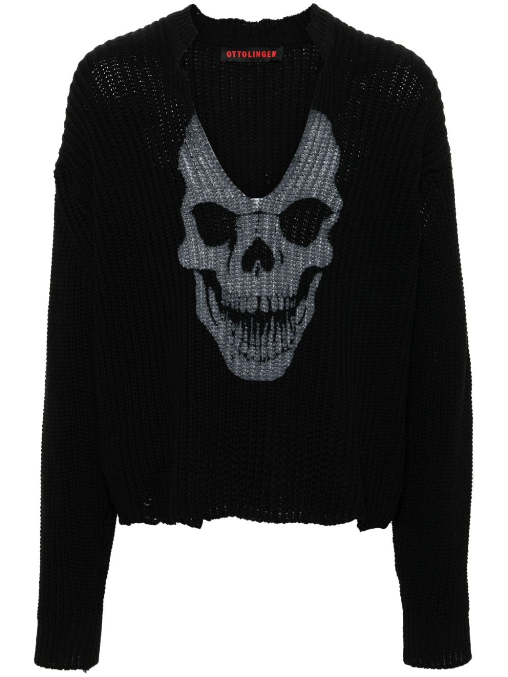 skull-print V-neck jumper Highlights - Black - Recycled cotton - Knitted construction - Skull print to the front - Logo print to the rear - Ripped detailing - V-neck - Drop shoulder - Long sleeves - High-low hem - When buying this unisex item, keep in mind that it is graded in standard men's sizing. Imported Composition Recycled Polyester 50%, Recycled Cotton 50% SIZE & FIT Model measurements Height 5 ft 11 in(1.8 m) Bust/Chest 31.49 in(80 cm) Hips 35.82 in(91 cm) Waist 24.8 in(63 cm) FittingInformation This unisex piece is designed for a loose fit whether you usually select women's or men's sizes Made with a midweight knit, this piece offers some stretch