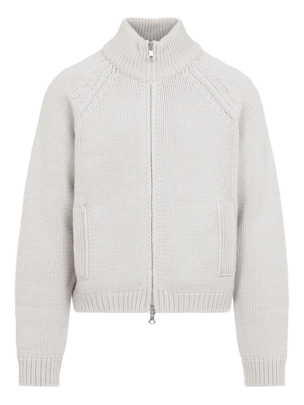high-neck zip-front cardigan Highlights - White - Zip fastening - High neck - Long sleeves - Ribbed cuffs - Welt pockets Imported Composition Wool 100% Washing instructions Read Manufacturer Guidelines