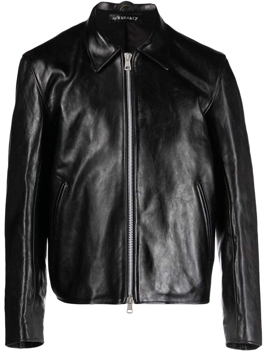 Mini leather zipped jacket Made in Portugal from supple calf leather worked to a high-shine finish, Our Legacy's Mini jacket draws inspiration from classic biker silhouettes. It falls to a boxy-fit whilst fastening at the front with a silver-tone zip. Highlights - Black - Calf leather - Classic collar - Front zip fastening - Two side slit pockets - Long sleeves - Straight hem - Fully lined Imported Composition Outer: Cotton 100%, Calf Leather 100% Lining: Cotton 75%, Viscose 25% SIZE & FIT Model measurements Height 6 ft 1 in(1.86 m) Bust/Chest 37.4 in(95 cm) Hips 36.22 in(92 cm) Waist 29.52 in(75 cm) FittingInformation Designed for a slim fit, offering a comfortable fit that sits just away from the body Firm leather offering little flexibility to maintain its durability and sturdiness This piece fits true to size – take your usual size Washing instructions Specialist Cleaning