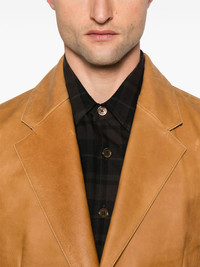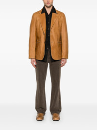 Opening blazer Highlights - Camel brown - Front button fastening - Two front jetted pockets - American rear vent - Long sleeves Imported Composition Outer: Calf Leather 100%, Cattle Horn 100% Lining: Cotton 100%, Viscose 100% SIZE & FIT Model measurements Height 6 ft 2 in(1.87 m) Bust/Chest 37.79 in(96 cm) Hips 37.79 in(96 cm) Waist 30.31 in(77 cm) FittingInformation Designed to be unstructured, offering a loose fit throughout The vented hem offers movement at the rear Made from a midweight non-stretch fabric