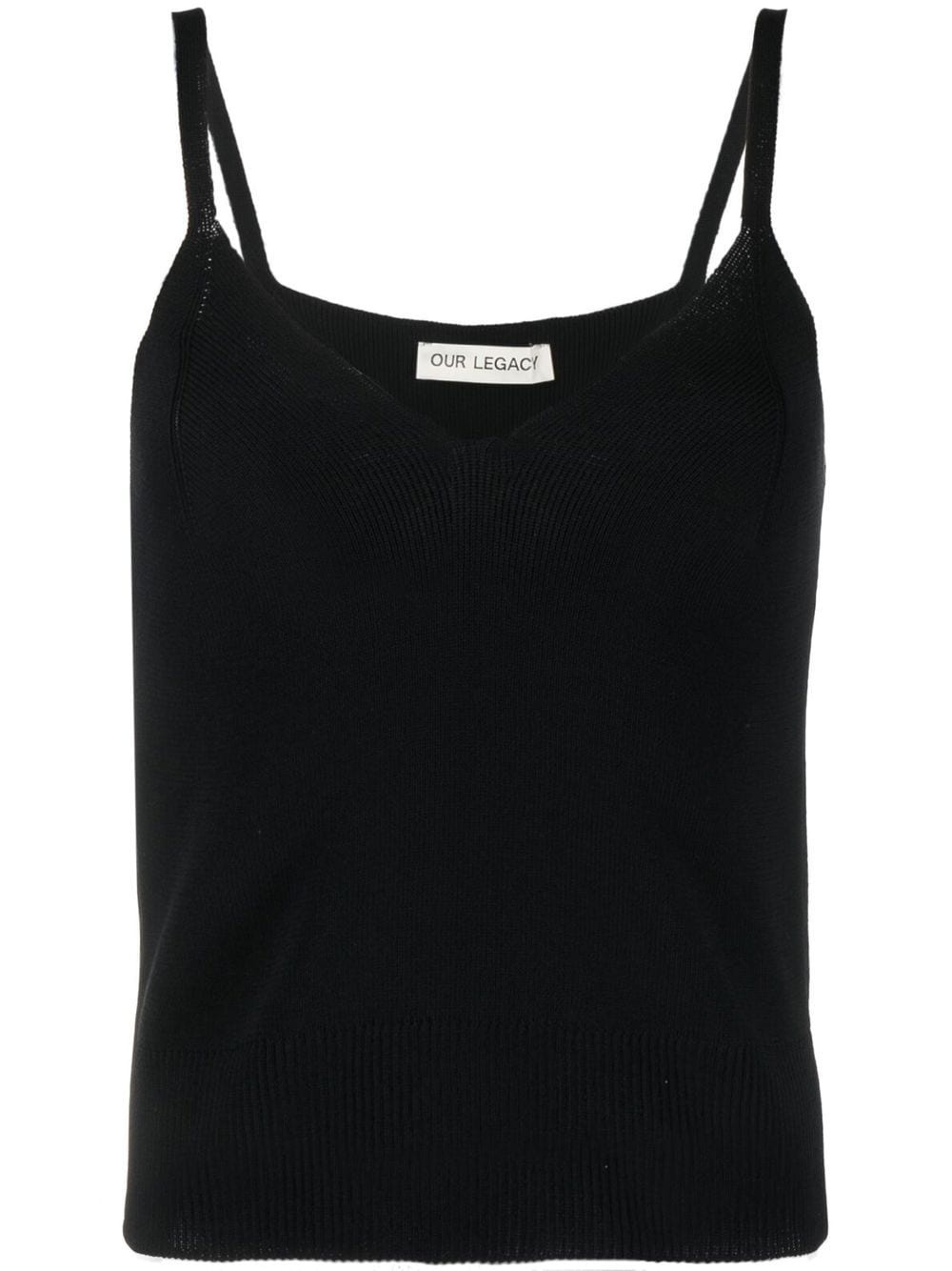 ribbed-knit singlet top black cotton blend ribbed knit V-neck thin shoulder straps straight hem Imported Composition Cotton 84%, Polyamide 16% SIZE & FIT Model measurements Height 5 ft 11 in(1.8 m) Bust/Chest 31.49 in(80 cm) Hips 35.43 in(90 cm) Waist 24.4 in(62 cm) FittingInformation This piece fits true to size. We recommend you get your regular size Cut for a slim fit Made with a mid-weight fabric Washing instructions Machine Wash