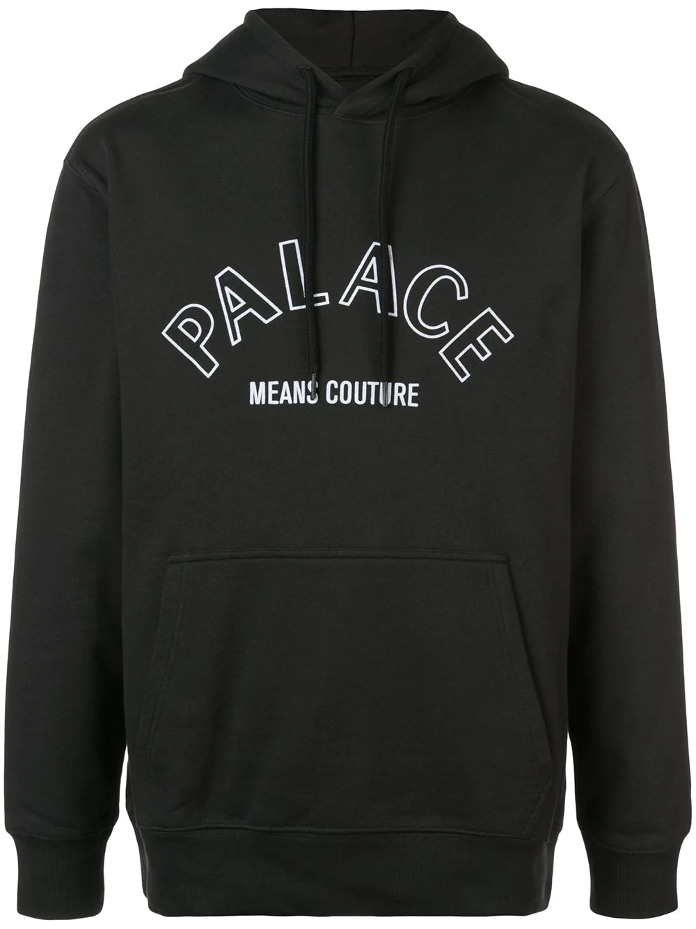 Couture "Black" drawstring hoodie The Palace Couture Hoodie in Black is a premium hooded sweatshirt by the London-based skateboard and streetwear brand. The design is a riff on the classic Versace “Jeans Couture” logo. The hoodie features a heavyweight fleece build in black with the graphic contrasting in white. The black Palace Couture Hoodie was a popular piece from the Palace Summer 2018 line. Imported Composition Cotton 100% SIZE & FIT Model measurements Height 6 ft 2 in(1.88 m) Bust/Chest 38.18 in(97 cm) Hips 37 in(94 cm) Waist 29.92 in(76 cm) Washing instructions Machine Wash