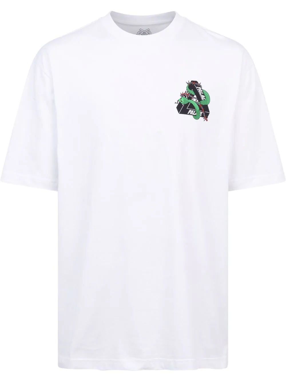 Hesh Mit Fresh T-shirt Crafted from cotton, this T-shirt is from the “Hesh Mit Fresh” Palace collection. Incorporating bold graphics and colours, with artwork depicting coiled snakes and barbed wire, the London-based skate brand displays a more tattoo-influenced aesthetic here. Made in United States Composition Cotton 100%