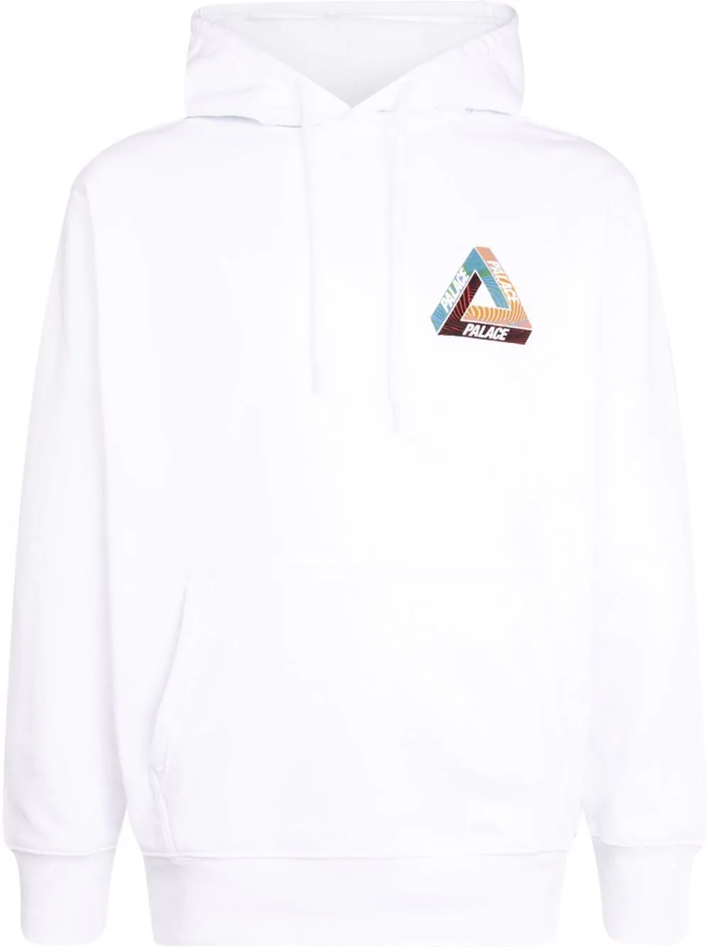 Tri-Tex logo-print London-based skate brand Palace's ever-present Tri-Ferg logo has seen many iterations. This stroke-style SS21 version is stamped on this hoodie's chest, with a larger size to the rear. The white background highlights the motif's blue, black and yellow colourway. Made in United States Composition Cotton 100%