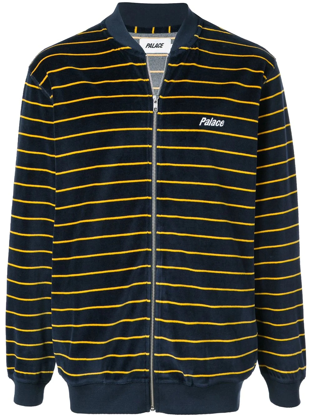 Velour bomber jacket The Palace Velour Bomber is a sweatshirt that resembles a bomber jacket. Perfect for day or night, the zip-up layering piece is navy with a yellow horizontal striped pattern. The elasticated cuffs, collar, and hemline are solid grey. Boasting a velour feel, this Palace Velour Bomber is made up of 80% cotton and 20% polyester. Fashion history tip: Velour was originally made popular in the late 1970s and many remember a resurgence when Tony Soprano wore a velour tracksuit religiously on The Sopranos. Imported Composition Cotton 80%, Polyester 20% SIZE & FIT Model measurements Height 6 ft 2 in(1.88 m) Bust/Chest 38.18 in(97 cm) Hips 37 in(94 cm) Waist 29.92 in(76 cm) Washing instructions Machine Wash