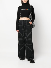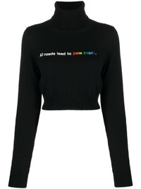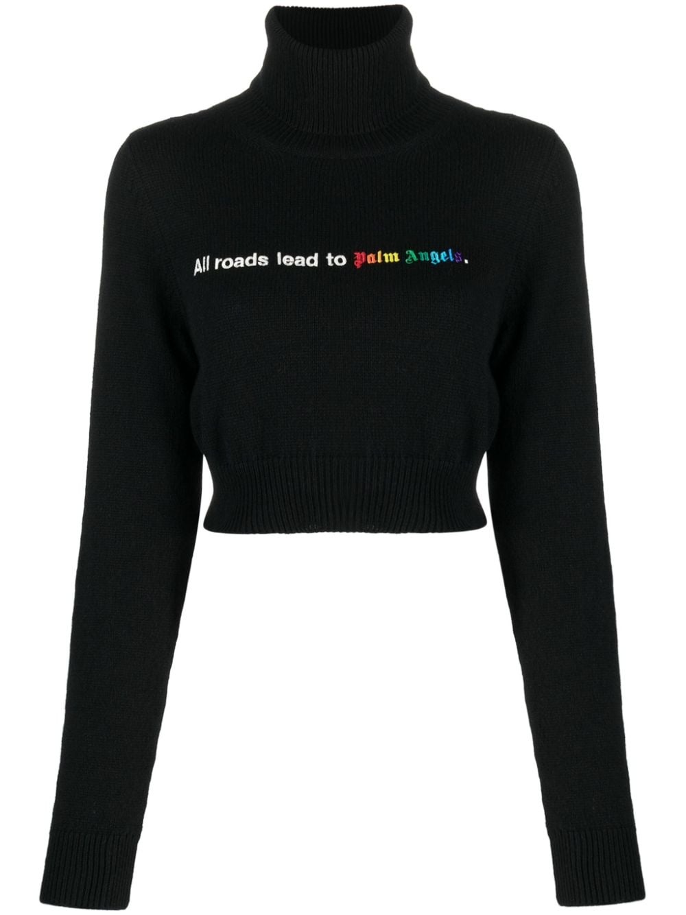 All Roads cropped jumper Spun with a cropped silhouette, this roll-neck jumper showcases how Palm Angels puts a streetwear spin on classic pieces. The black top is embroidered with a logo slogan across the chest. Highlights - Black - Embroidered slogan - Embroidered logo to the front - Roll neck - Long sleeves - Straight hem - Cropped Made in Italy Composition Polyester 100%, Merino 40%, Viscose 30%, Polyamide 20%, Cashmere 10% SIZE & FIT Model measurements Height 5 ft 10 in(1.78 m) Bust/Chest 31.49 in(80 cm) Hips 36.22 in(92 cm) Waist 25.59 in(65 cm) Measurement SLEEVE LENGTH 19.68 in(50 cm) LENGTH 14.37 in(36.5 cm) BUST 29.92 in(76 cm) FittingInformation Designed for a slim fit that sits just away from the body offering a close yet comfortable fit Cropped in length Made with a midweight knit, this piece offers some stretch This piece fits true to size – take your usual size Washing instructions Dry Clean Only